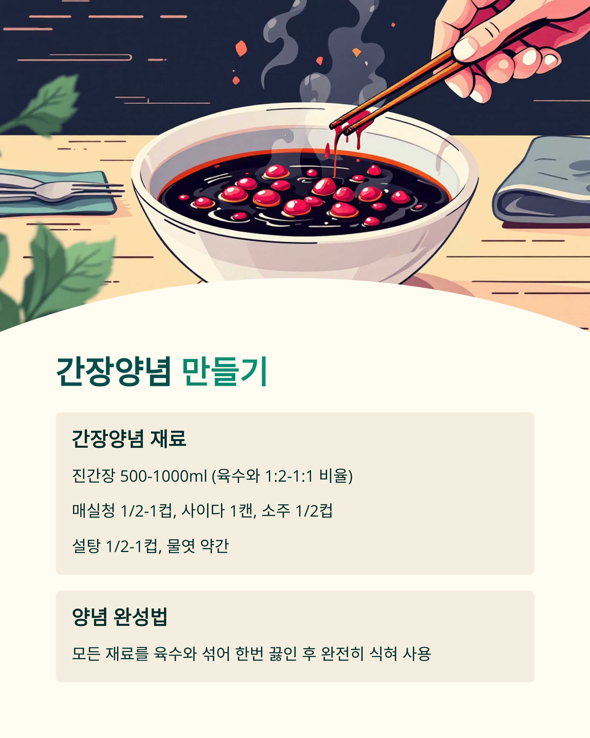 - 숙성: 2~3일 숙성, 간장 재가열 후 재부어 풍미 강화