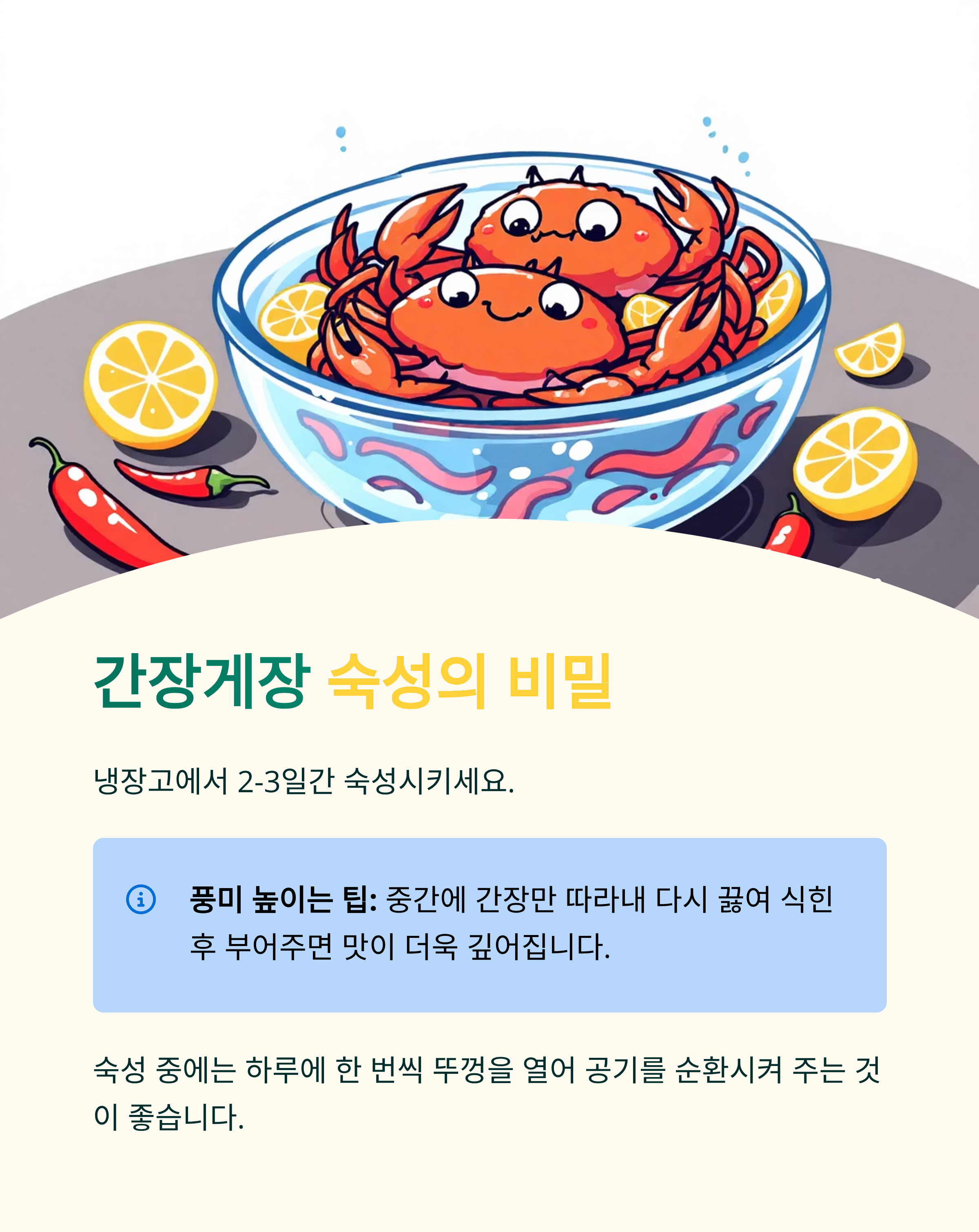 - 꽃게와 간장 분리: 오래 먹으려면 꽃게와 양념을 분리해 보관 후 먹을 때만 합침