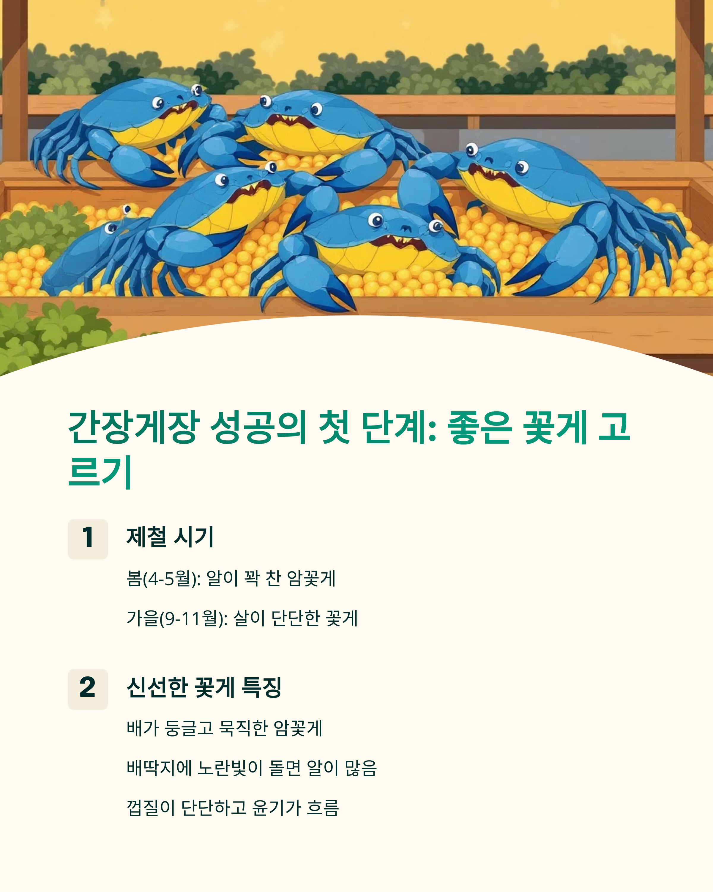 - 제철: 봄(4~5월, 알이 꽉 찬 암꽃게) / 가을(9~11월, 살이 단단한 꽃게)