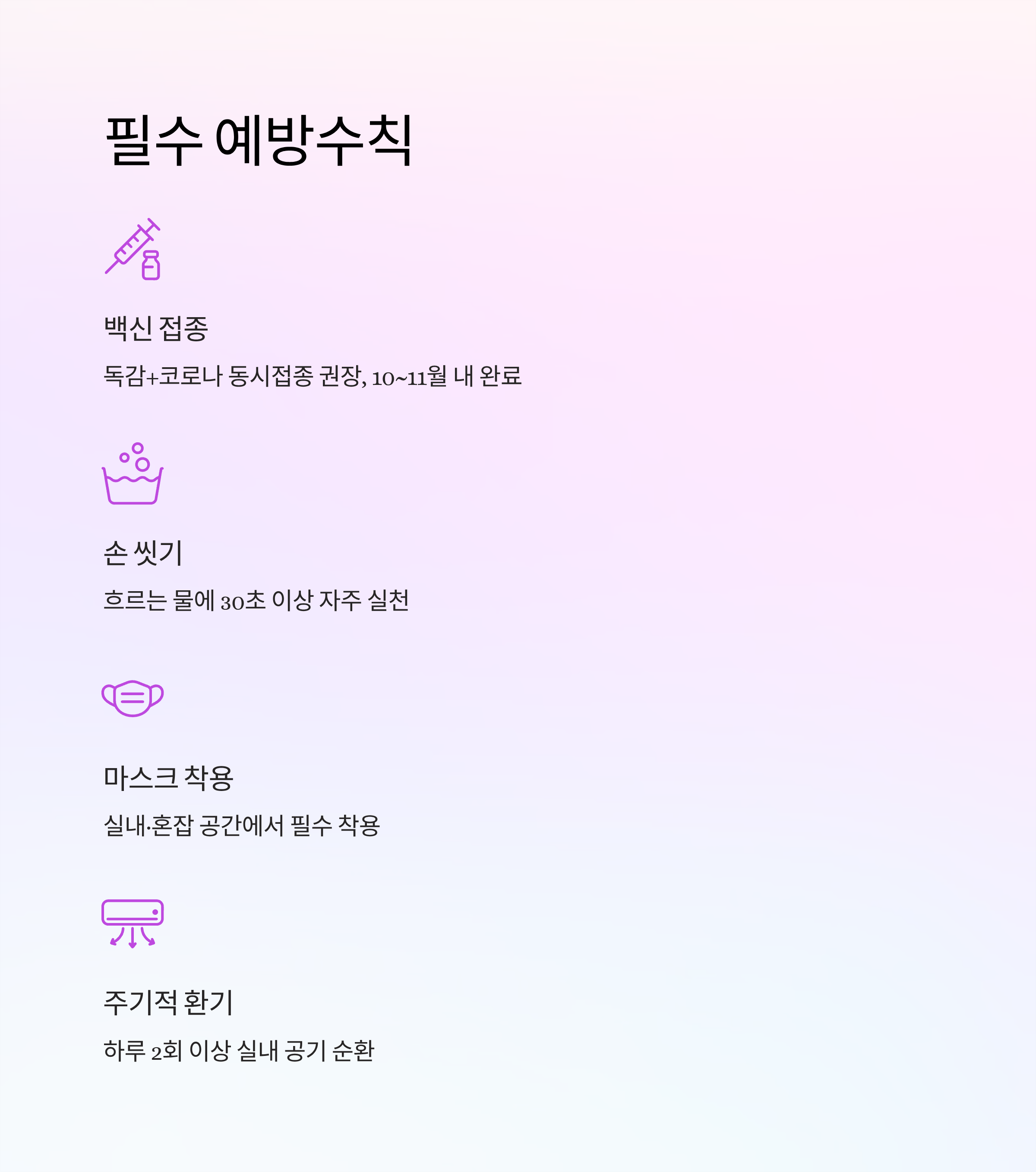 - 예방수칙: 손씻기, 기침 예절, 환기, 마스크 착용