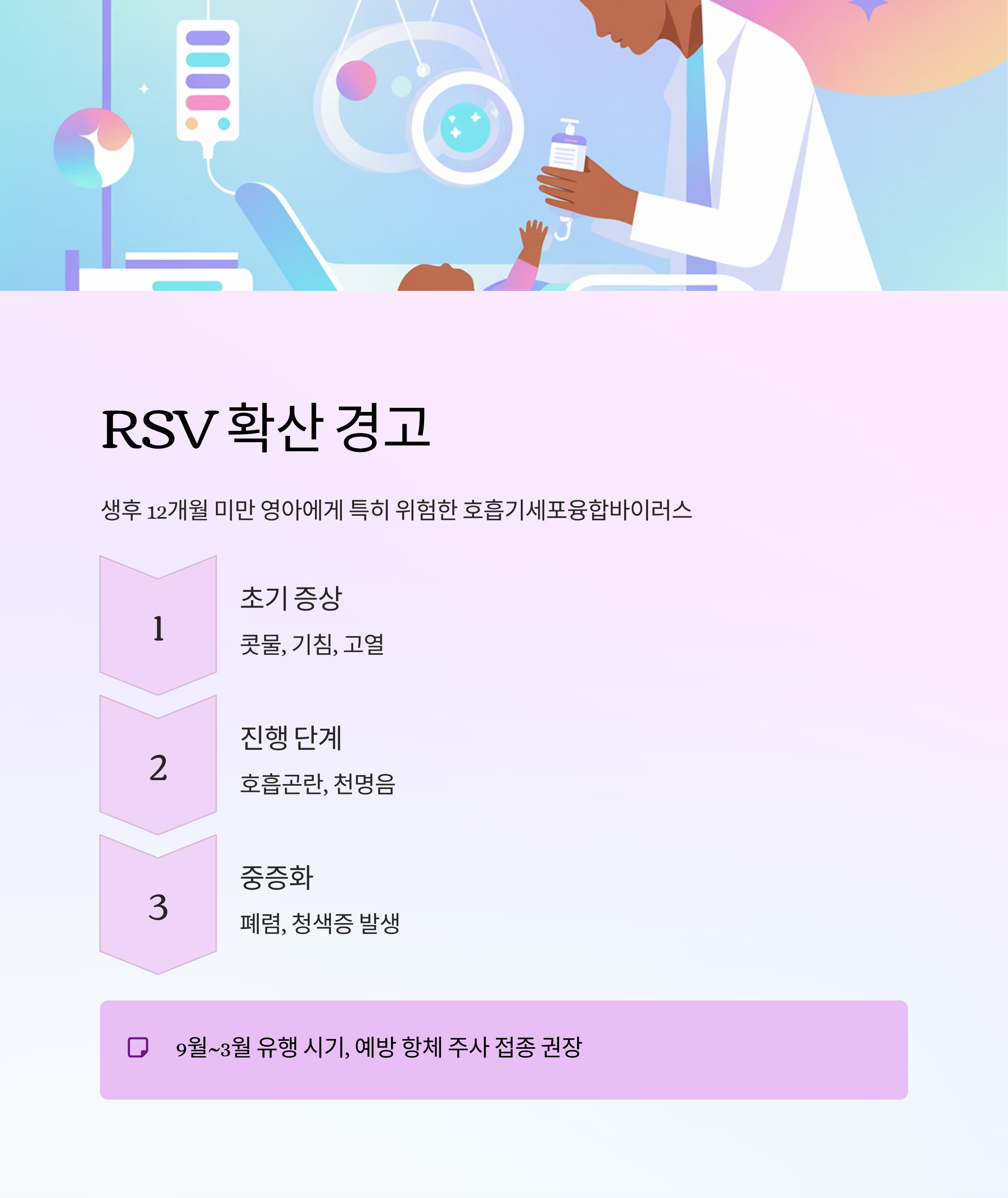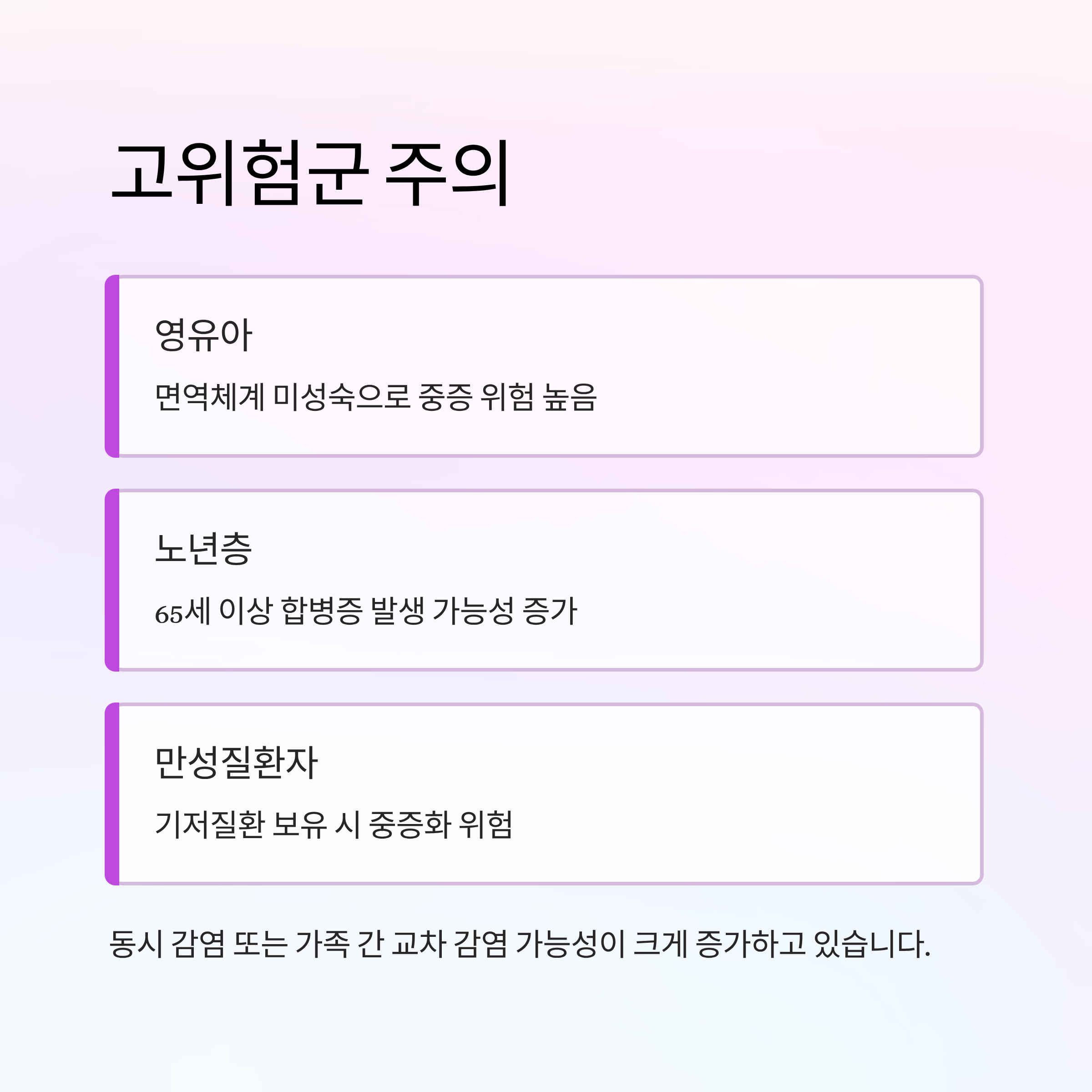 | 고위험군 증상 시 즉시 진료 | 영유아·노약자는 조기 진료 중요 |
