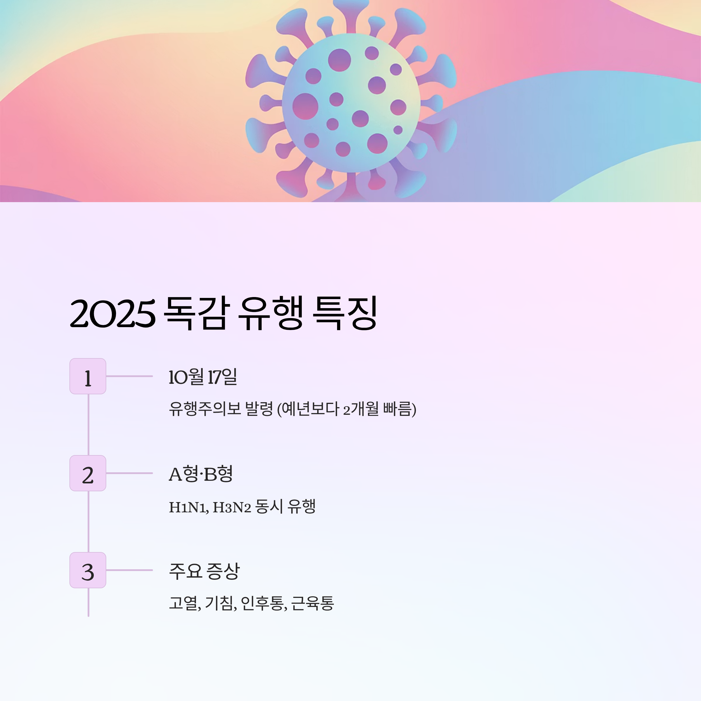- 바이러스 유형: A형(H1N1, H3N2) + B형 동시 유행