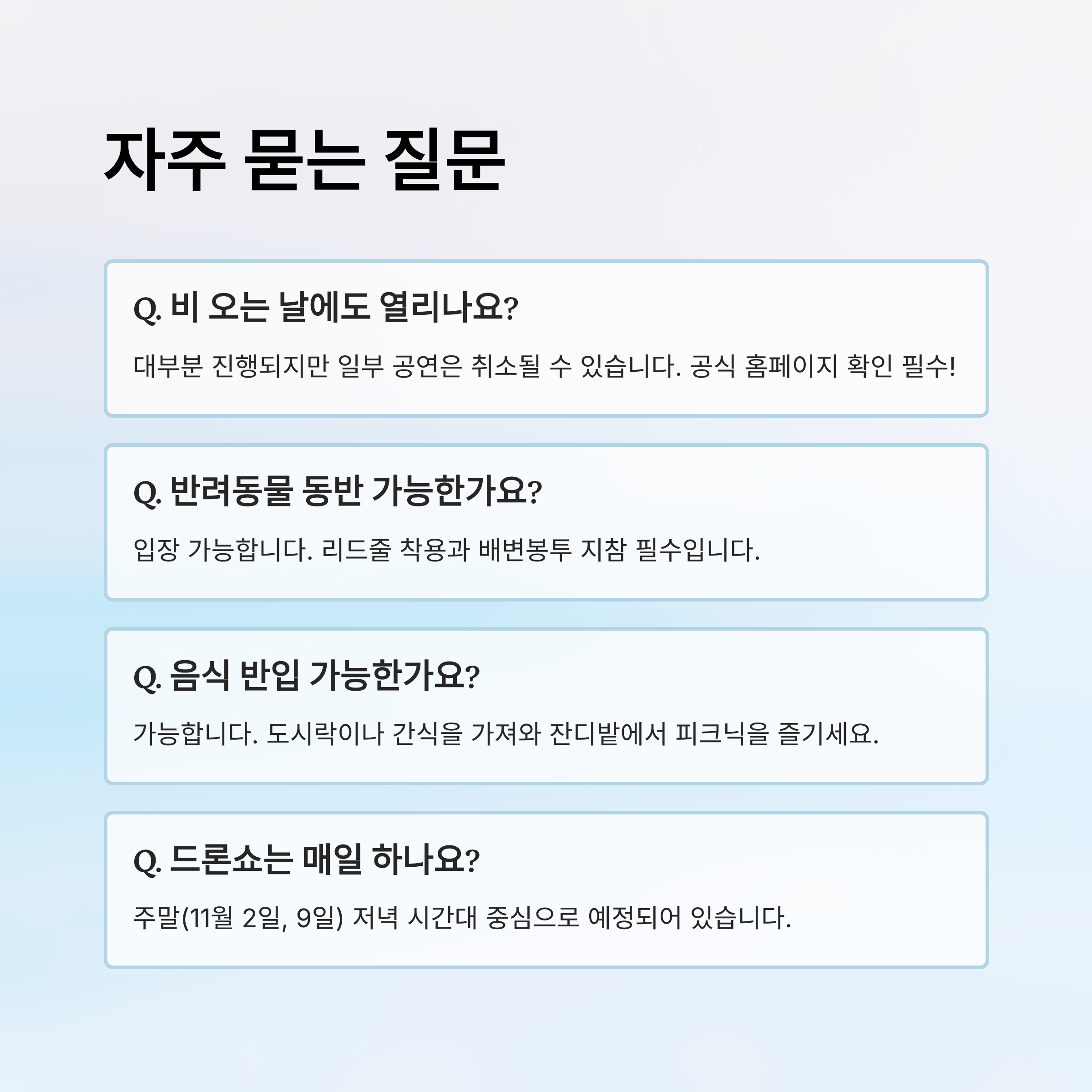A1. 대부분의 행사는 우천 시에도 진행되지만, 일부 공연은 취소될 수 있습니다. 공식 홈페이지에서 일정 확인 필수!