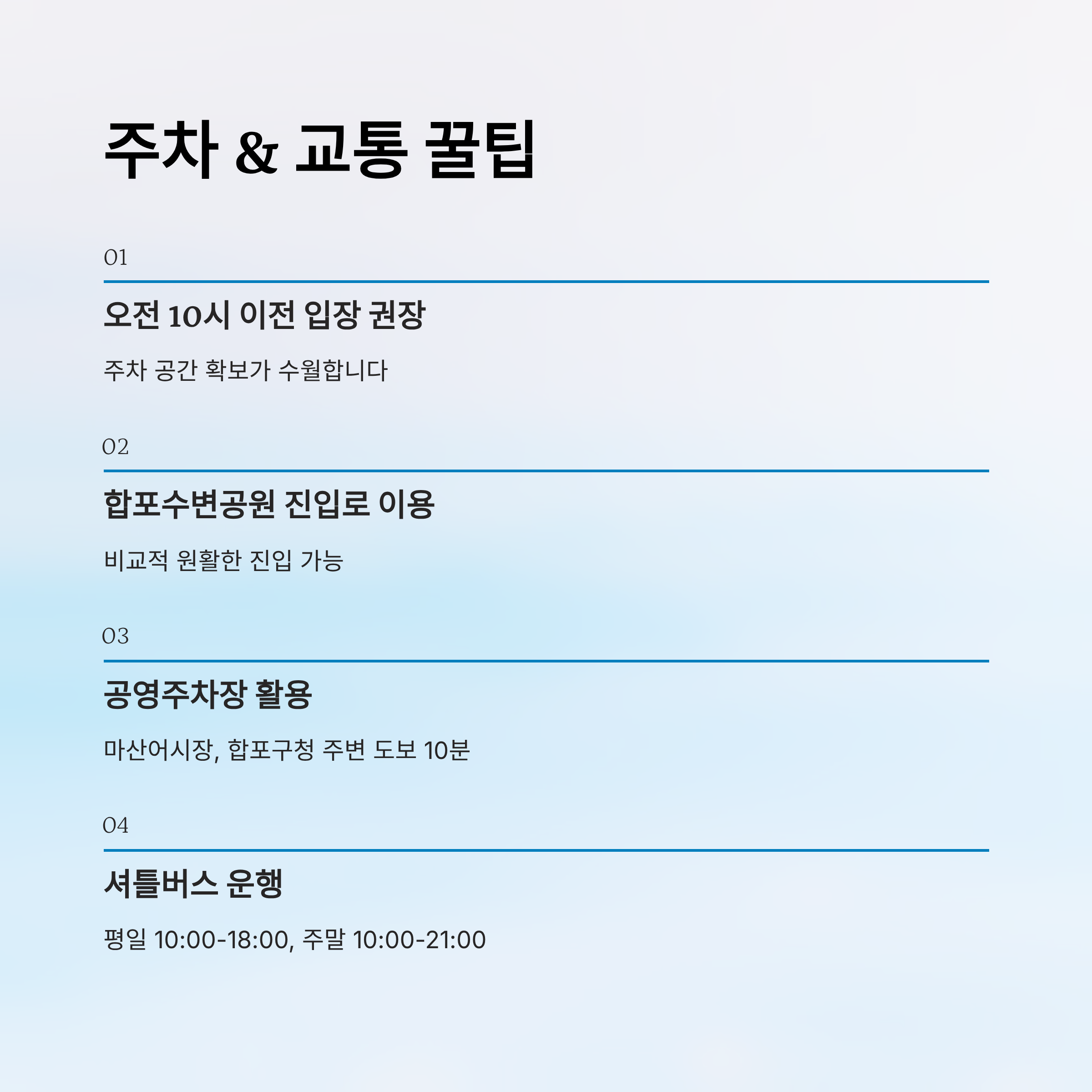 - 인근 로봇랜드나 마산항 바다 산책로와 연계해도 좋습니다.