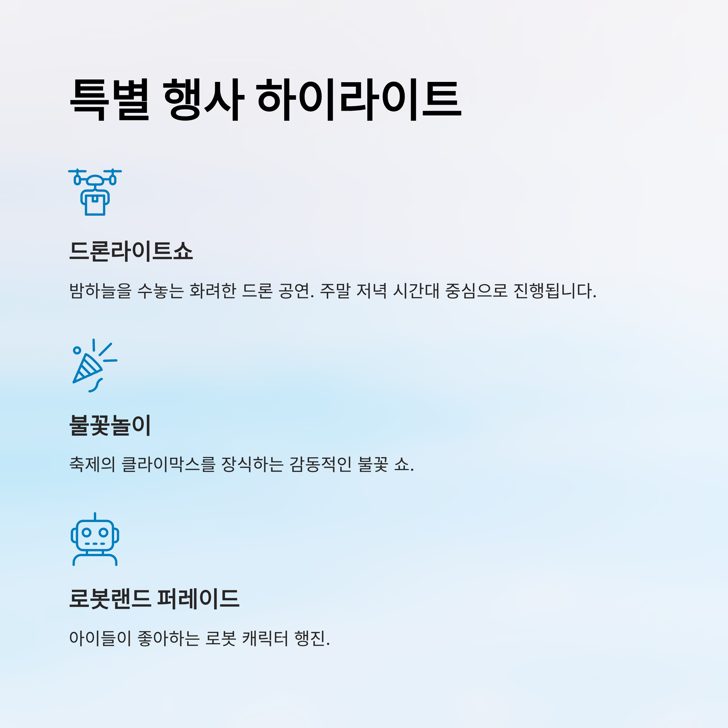 - 로봇랜드 퍼레이드 등 아이부터 어른까지 즐길 수 있는 다채로운 이벤트!