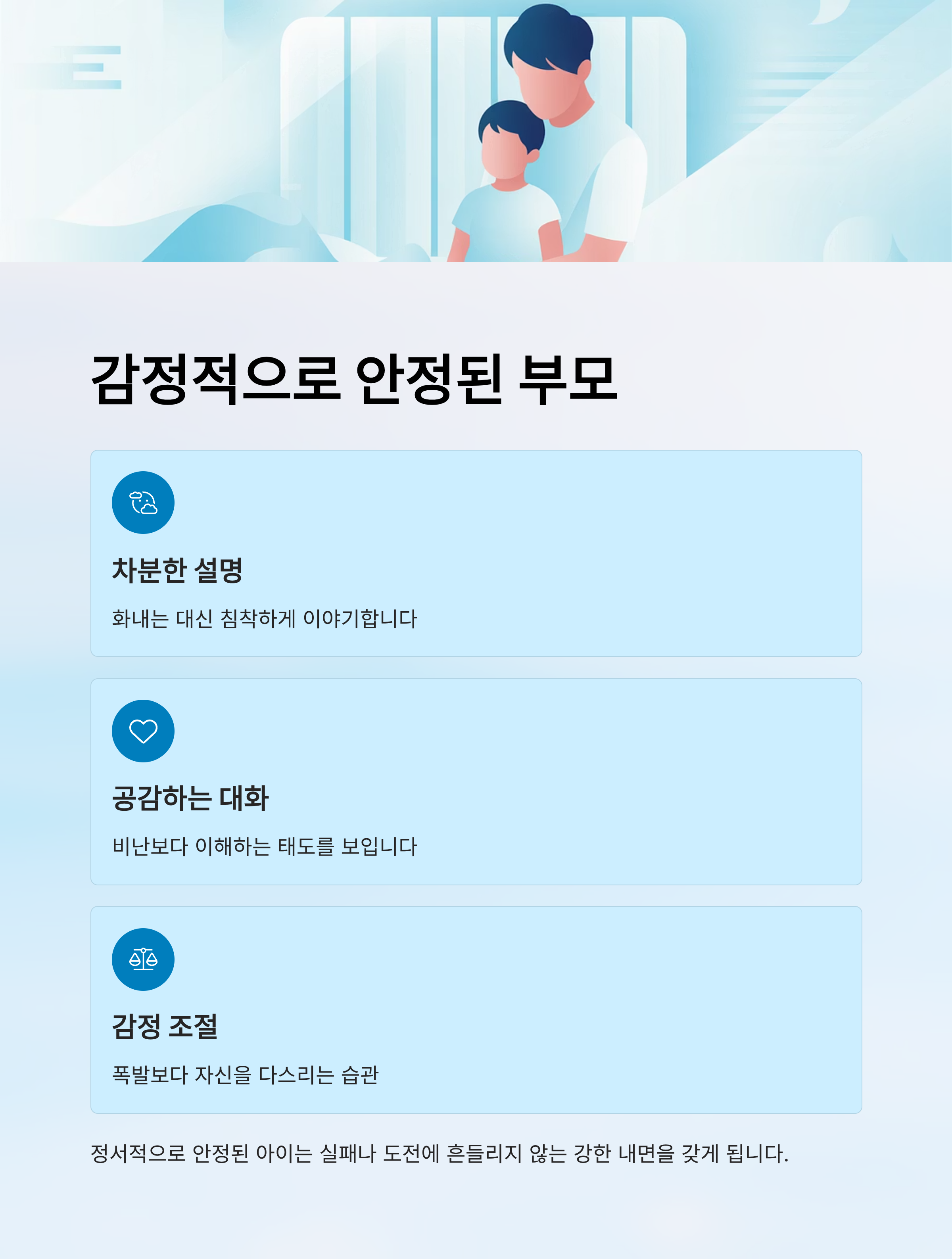 이러한 부모 밑에서 자란 아이는 정서적으로 안정되며, 실패나 도전에 흔들리지 않는 강한 내면을 갖게 됩니다.
