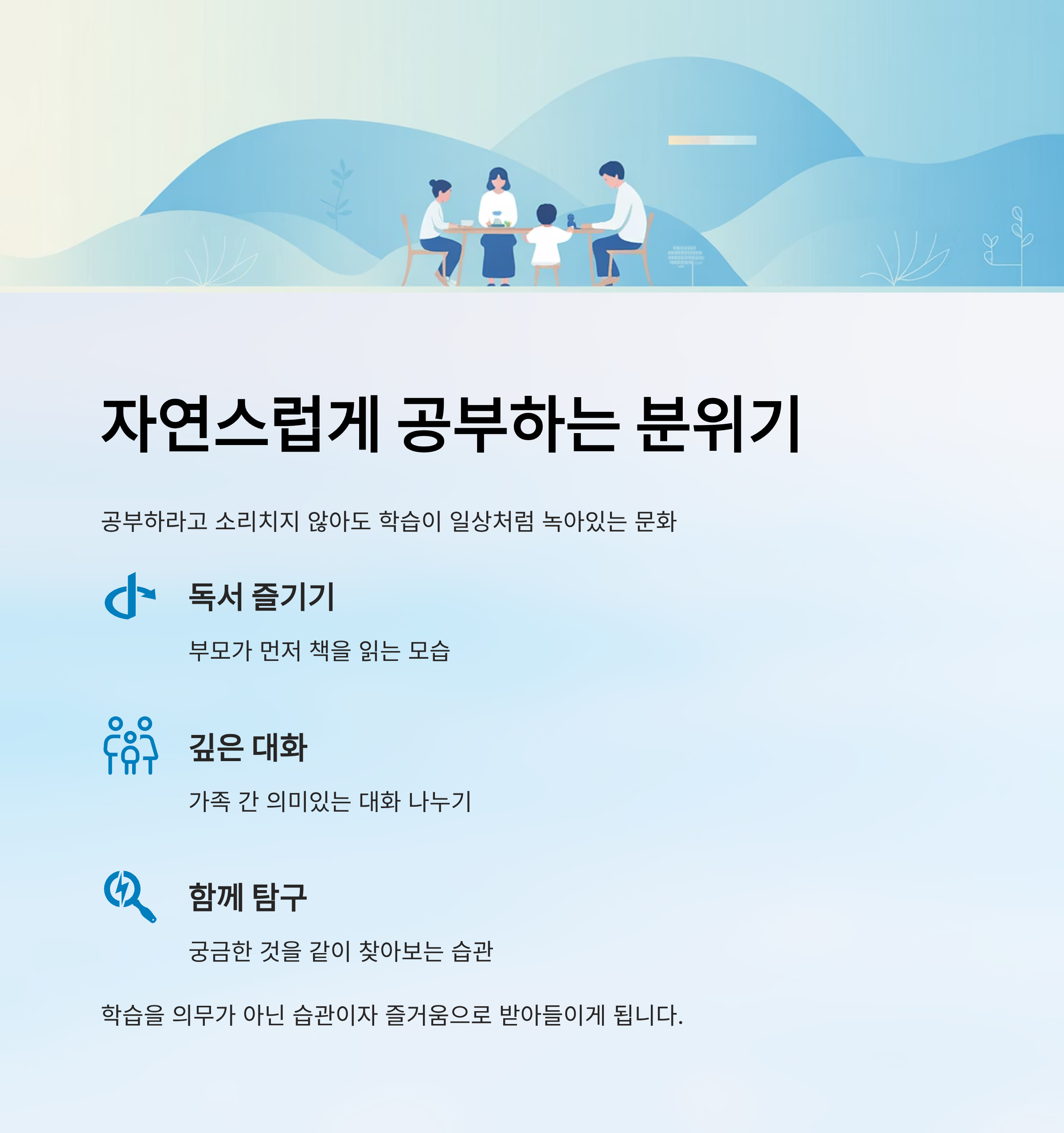 이런 환경은 아이에게 학습을 ‘의무’가 아닌 ‘습관’이자 ‘즐거움’으로 받아들이게 만듭니다.