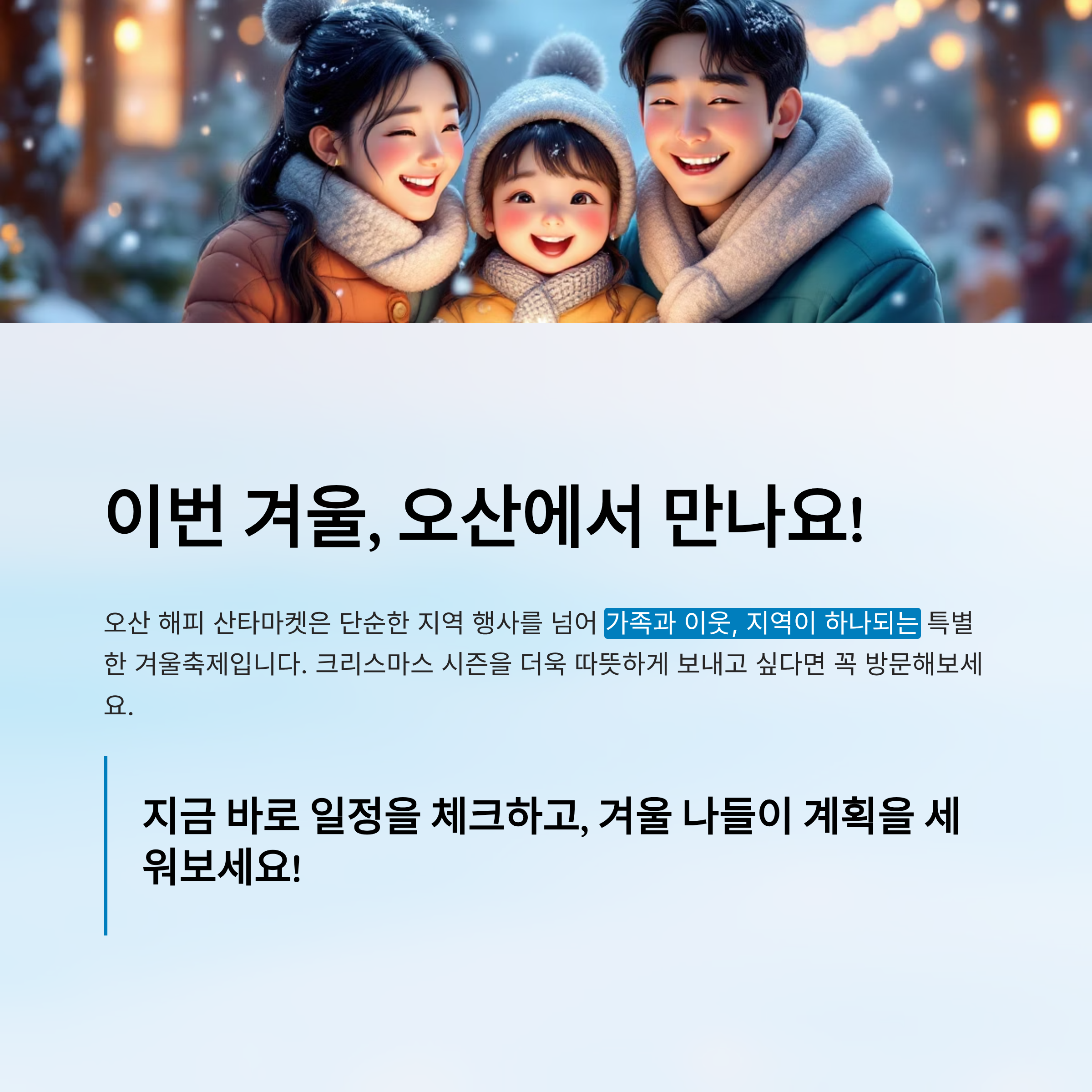오산 해피 산타마켓은 단순한 지역 행사를 넘어 가족과 이웃, 지역이 하나되는 특별한 겨울축제입니다. 크리스마스 시즌을 더욱 따뜻하게 보내고 싶다면 꼭 방문해보세요.