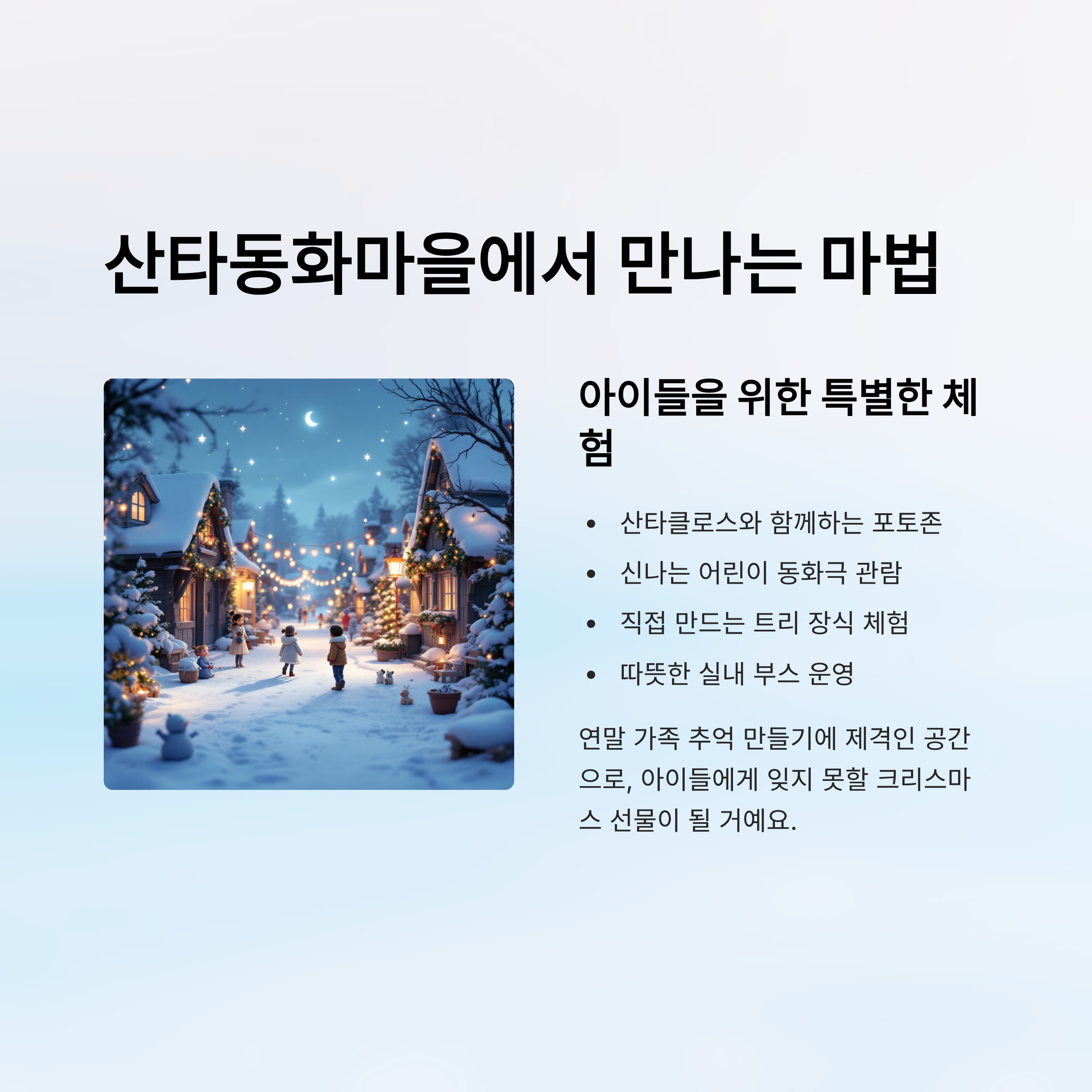 산타클로스와 함께하는 포토존, 어린이 동화극, 트리 장식 만들기 체험 등 가족 단위 방문객에게 딱 맞는 공간입니다. 아이들에게 꿈과 동심을 심어주는 공간으로, 연말 가족 추억 만들기에 제격입니다.