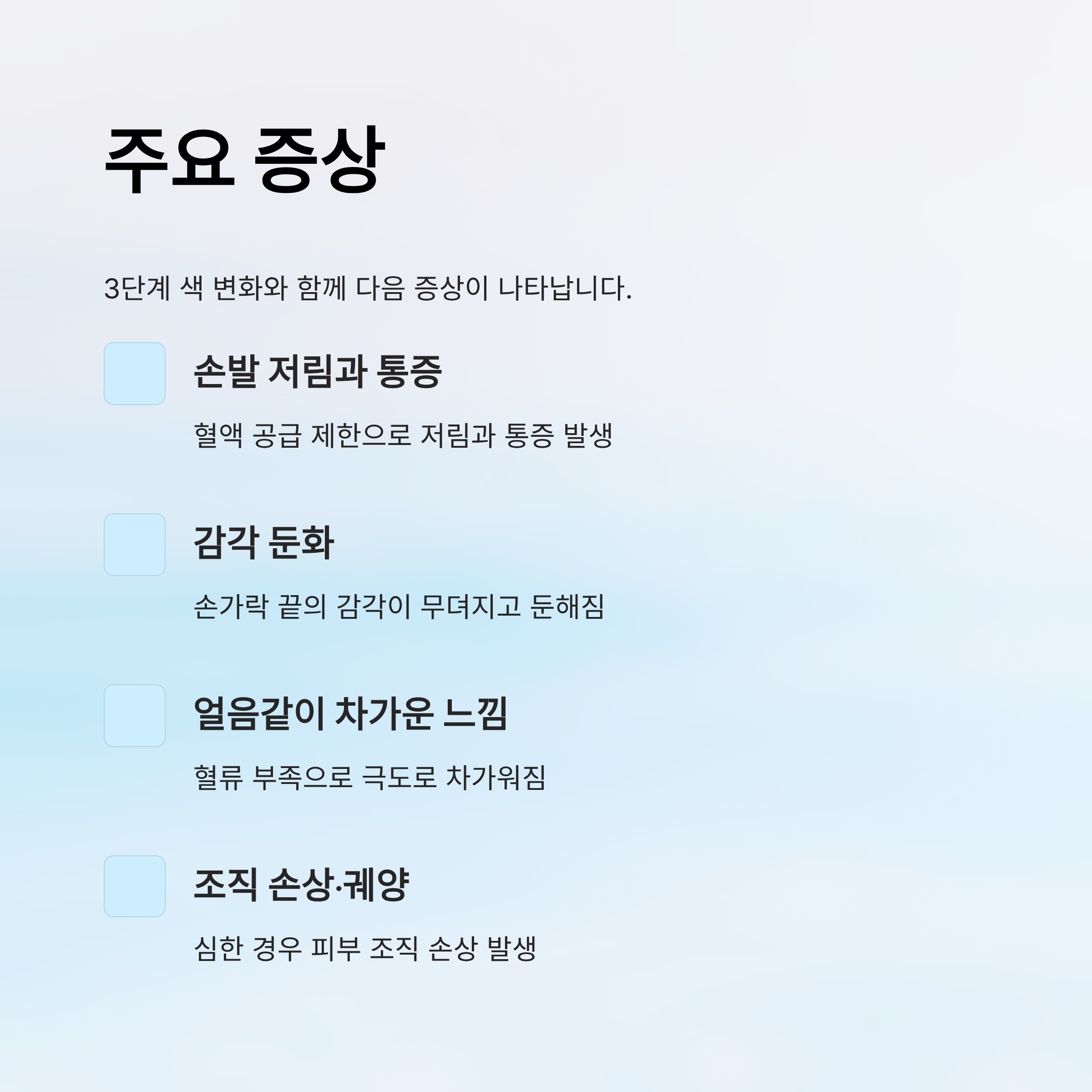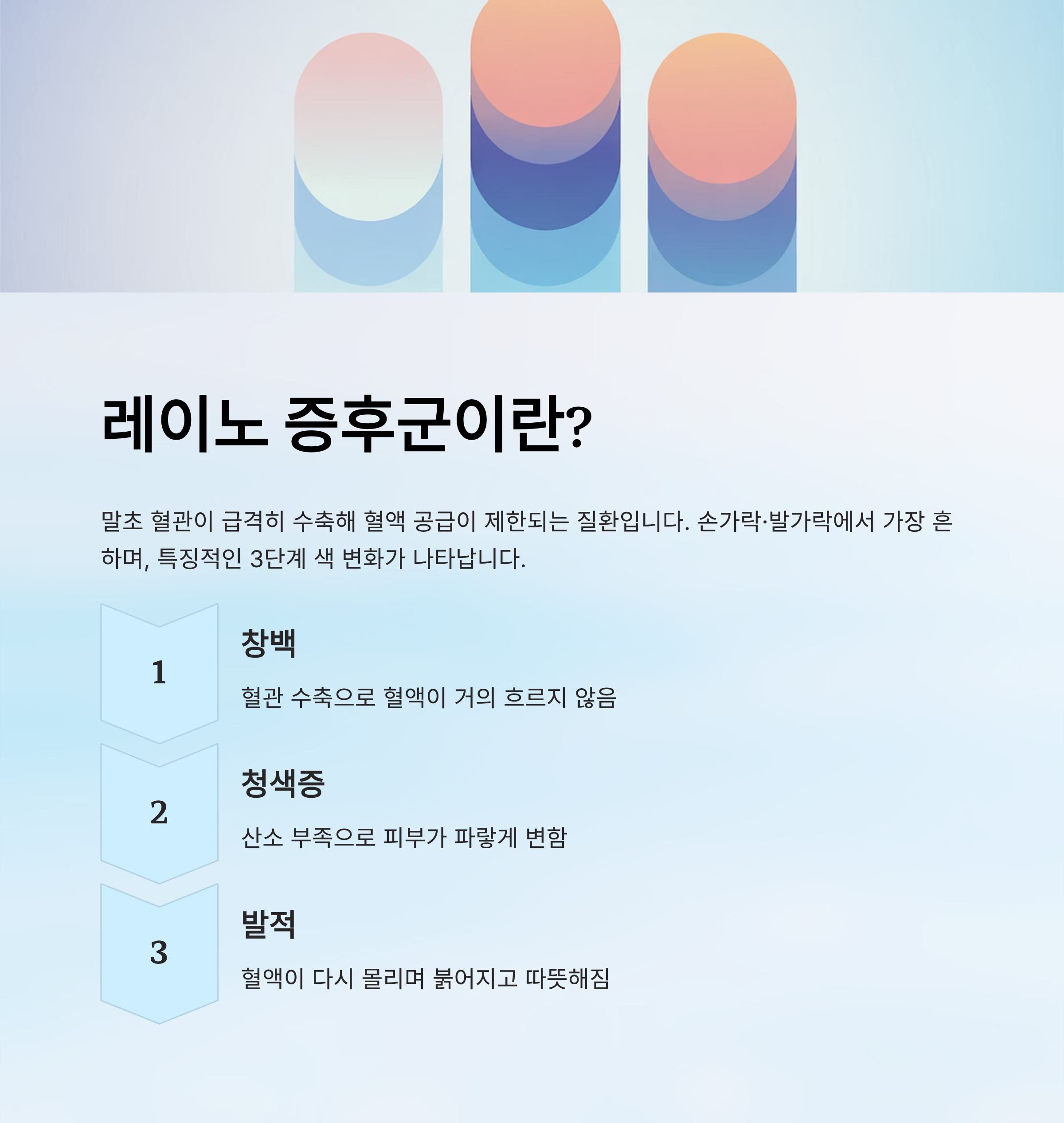 발생 양상은 창백 → 청색증 → 발적의 3단계 색 변화로 구분되며, 이 과정에서 통증·저림·감각 저하 등이 동반되기도 합니다.