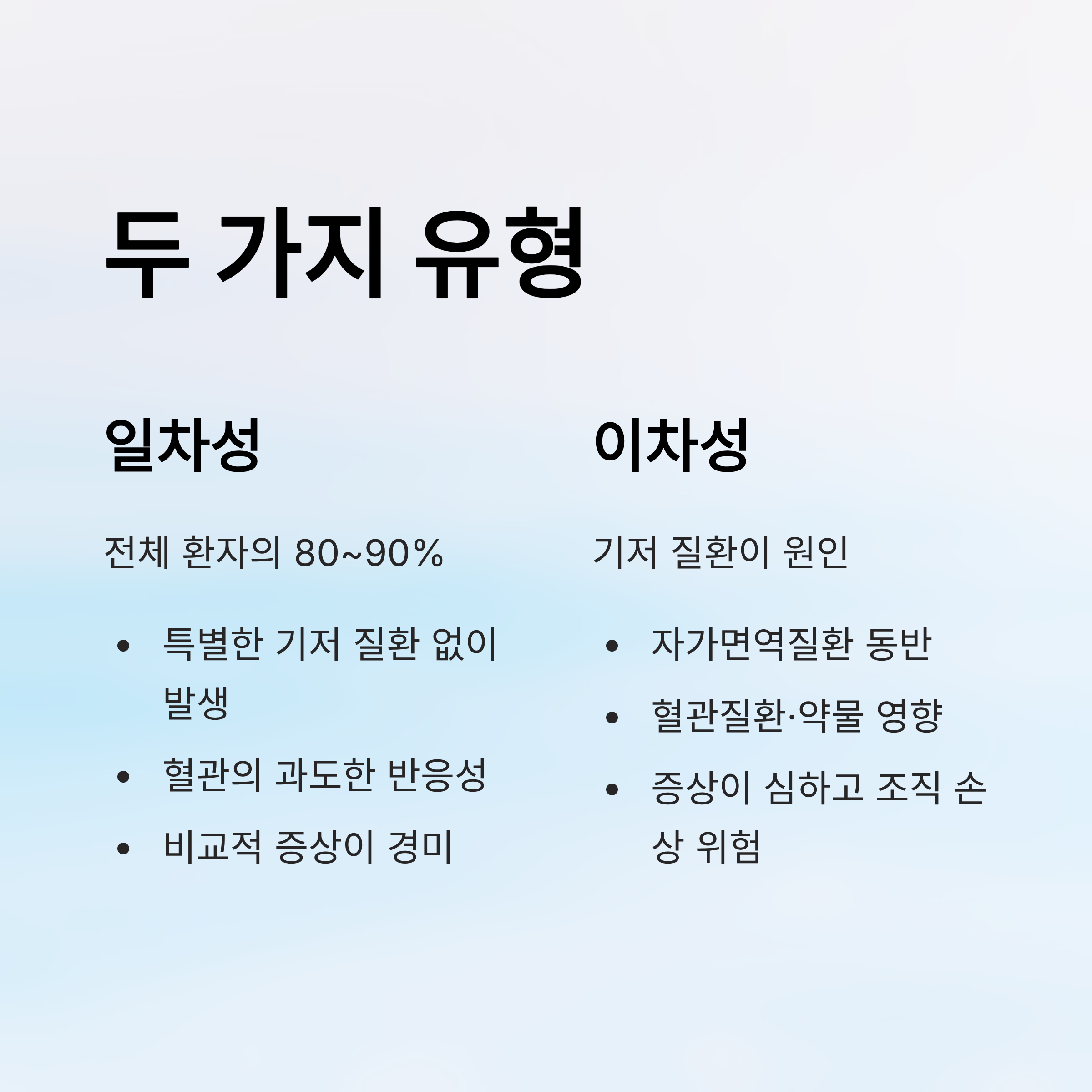 이차성은 다른 질환이나 약물, 혈관의 구조적 문제 때문에 발생합니다. 일차성보다 증상이 심하고 조직 손상 위험도 높습니다.