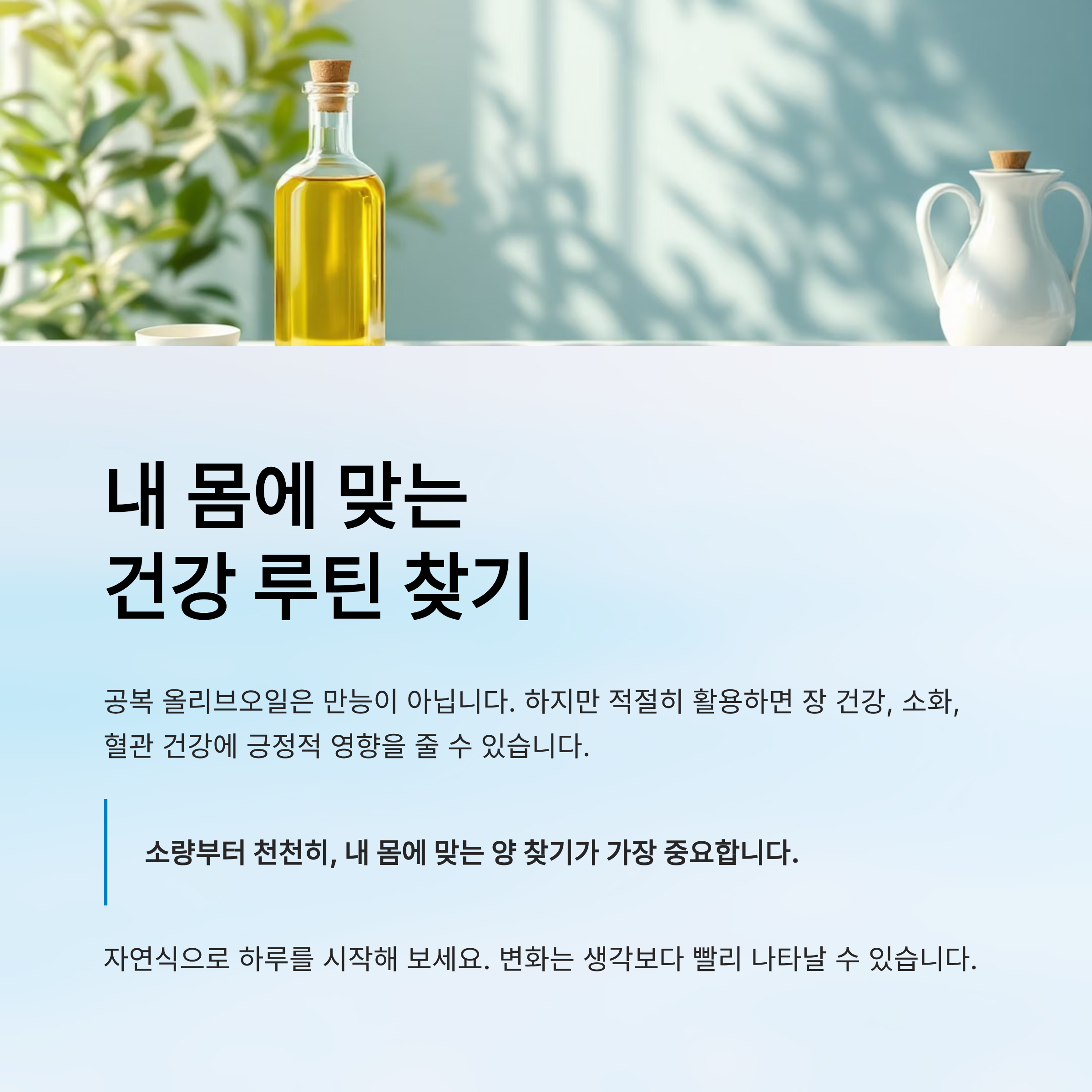 공복에 올리브오일을 마시는 습관은 누구에게나 효과적인 것은 아닙니다. 하지만 적절히 활용하면 장 건강, 소화, 혈관 건강에 긍정적인 영향을 줄 수 있습니다. 소량부터 천천히, 내 몸에 맞는 양 찾기가 가장 중요합니다.