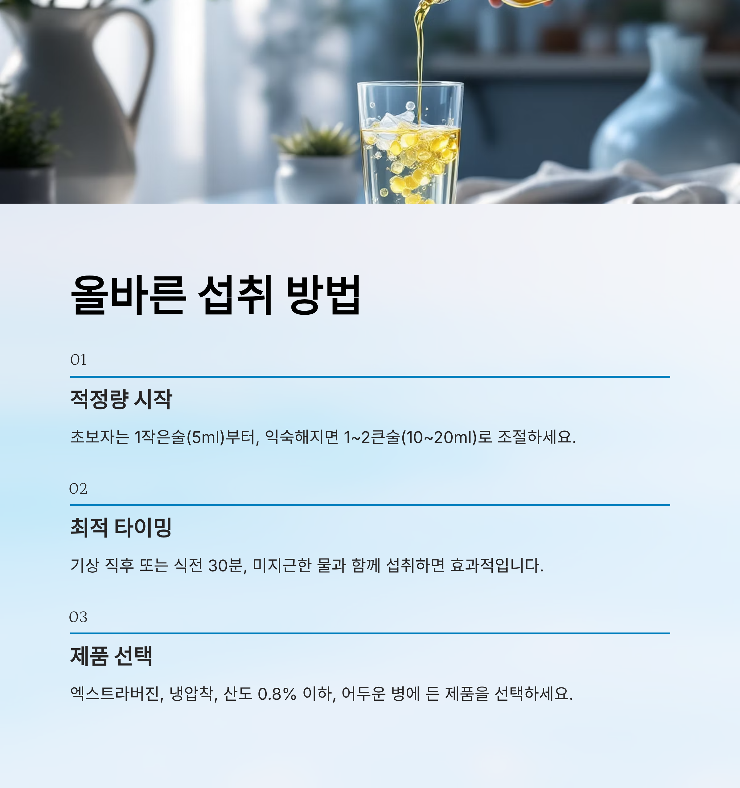 - 적정량: 하루 1~2큰술(10~20ml), 초보자는 1작은술(5ml)부터 시작