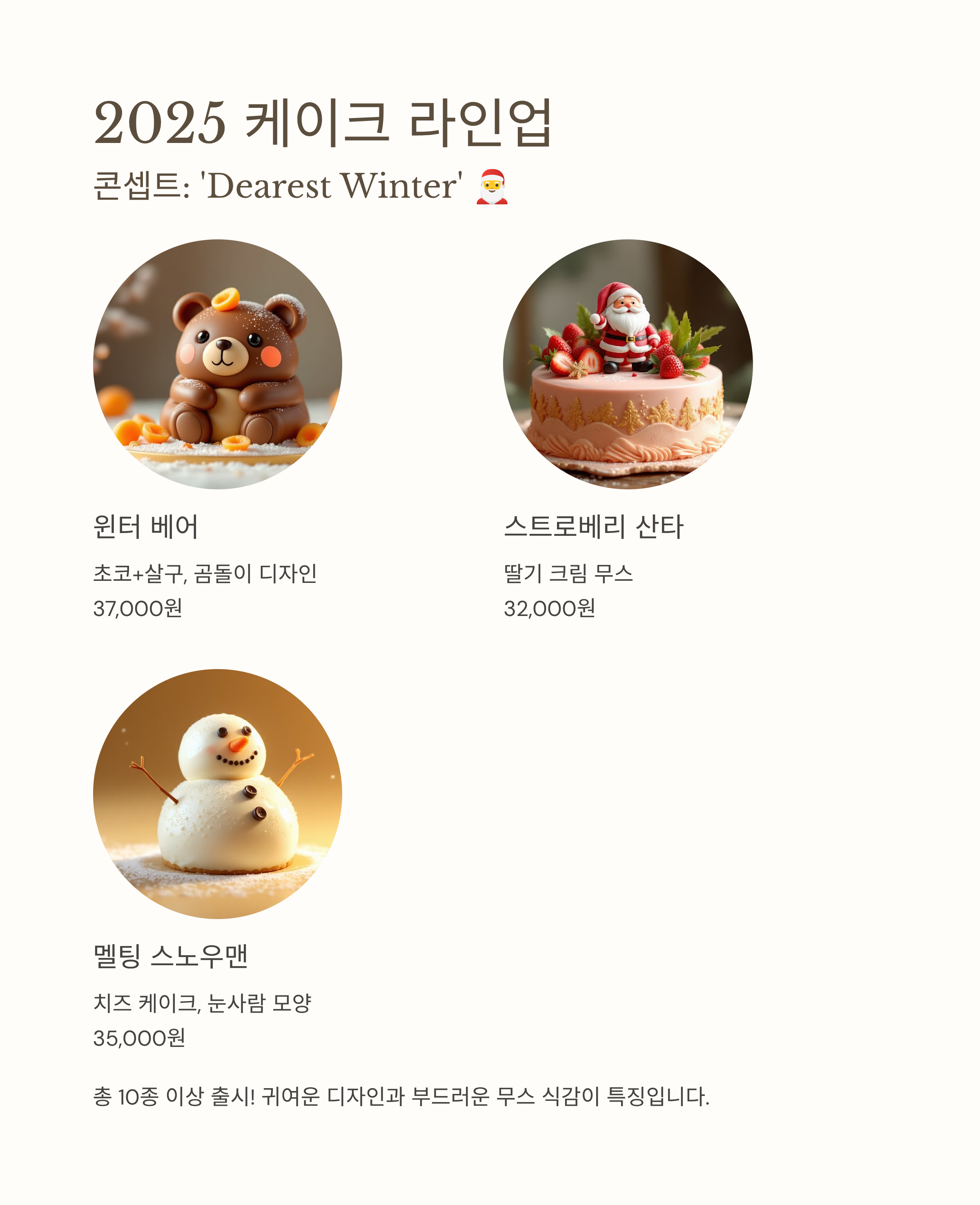 2025년 케이크 콘셉트는 ‘Dearest Winter’로 총 10종 이상 출시되었습니다. 주요 제품은 다음과 같습니다.