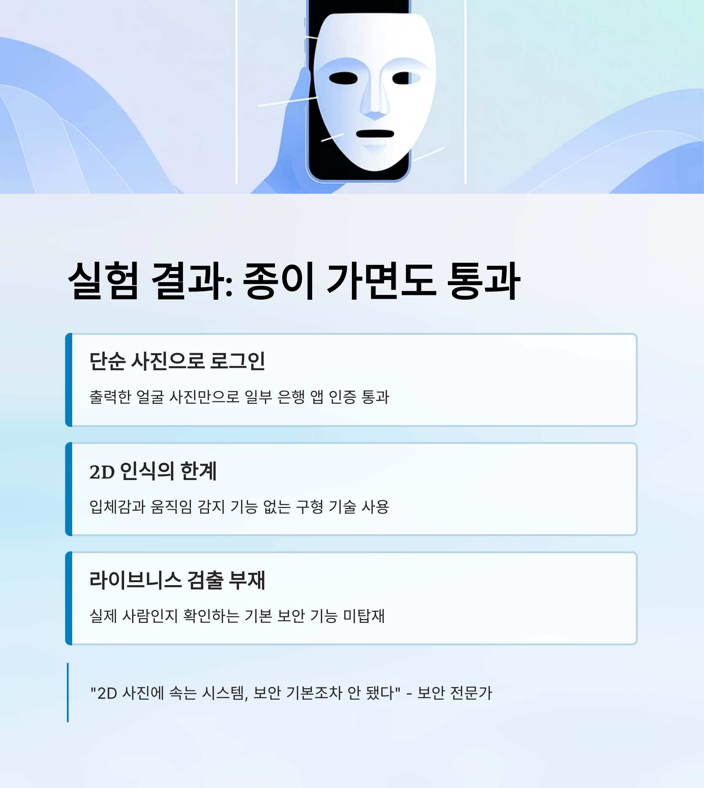 - 실험 결과, 단순 얼굴 사진만으로도 은행 앱 로그인 가능
