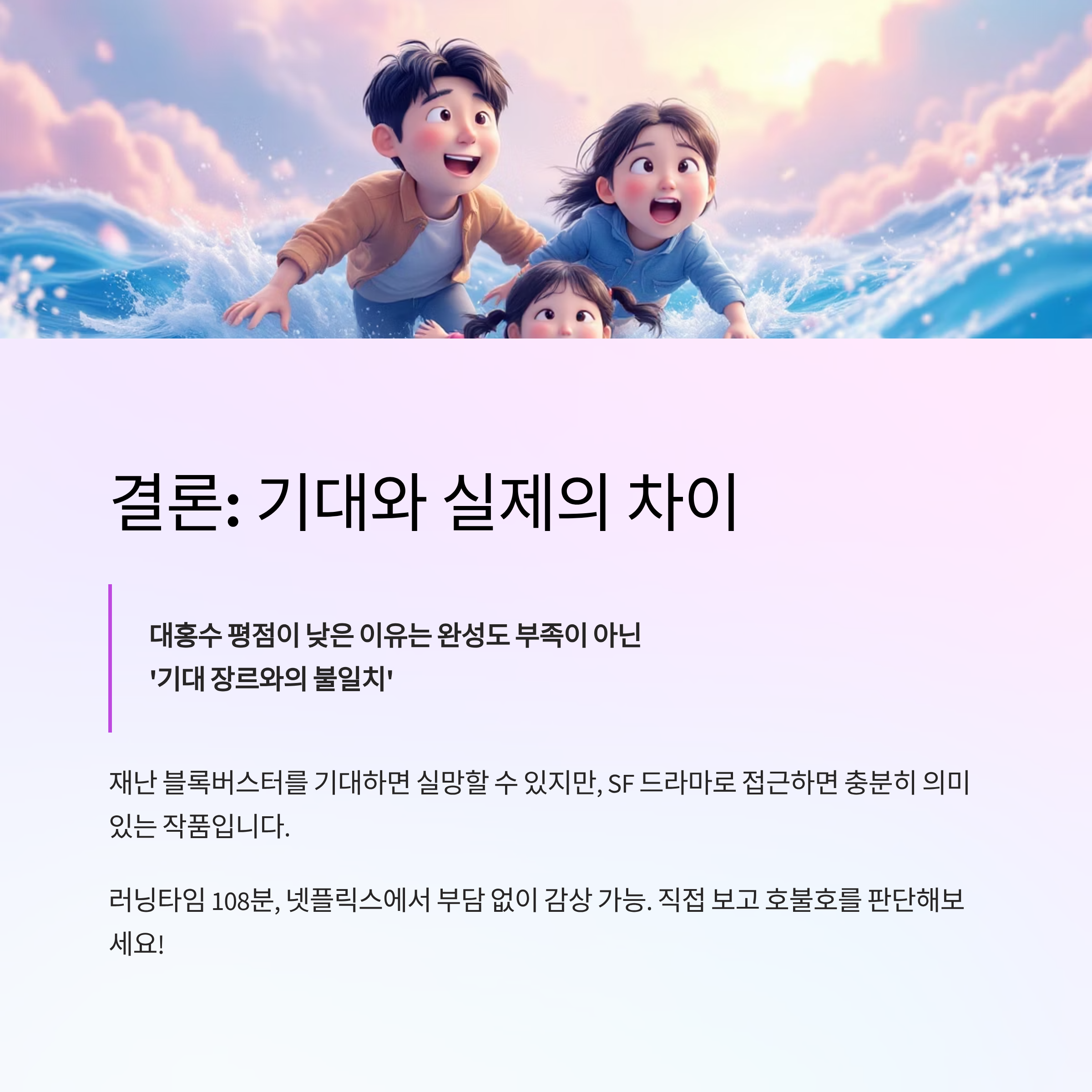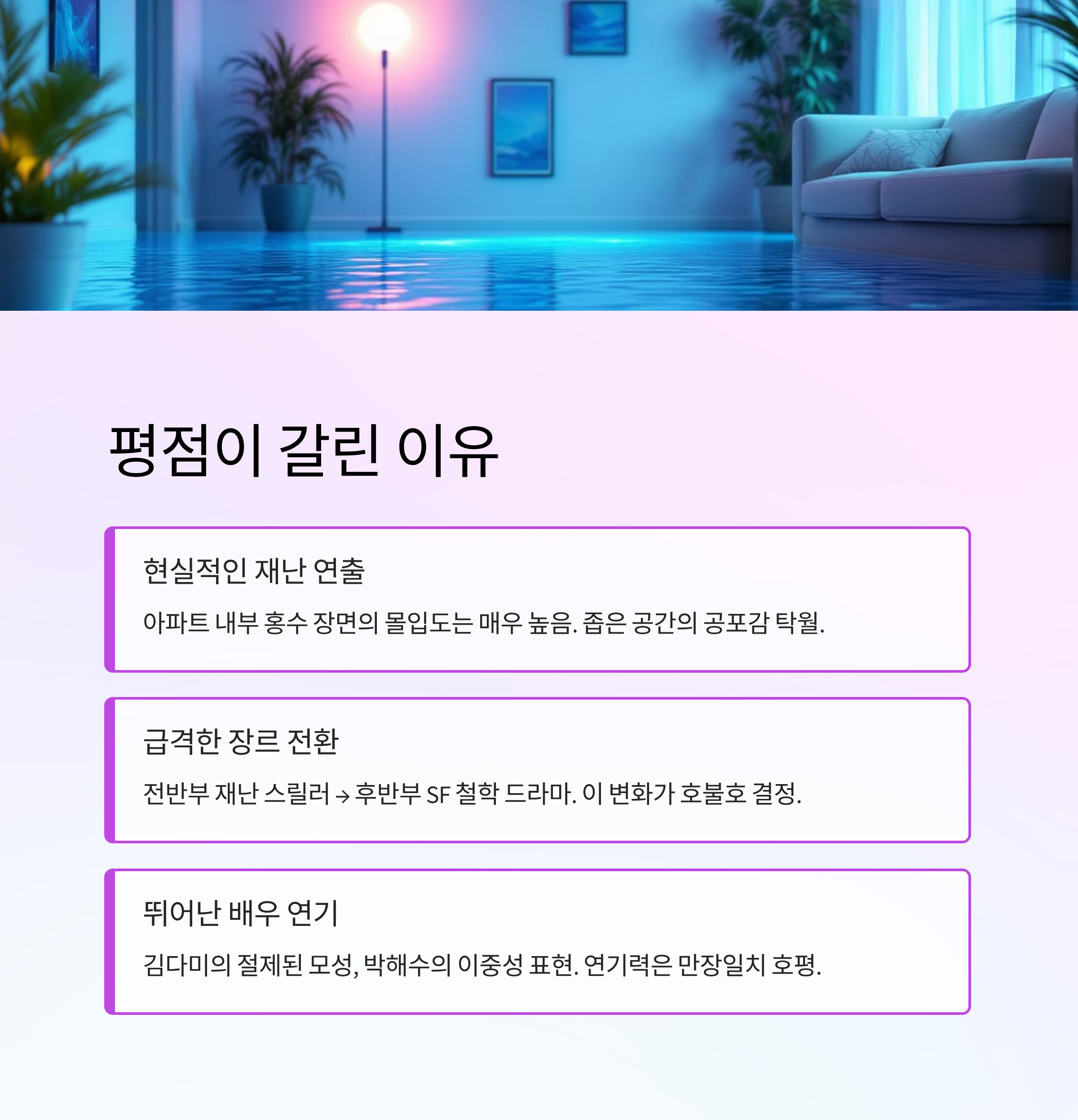 "대홍수 영화 평점이 낮게 보이는 이유는 ‘완성도 부족’보다는 ‘기대 장르와의 불일치"에 가깝습니다.