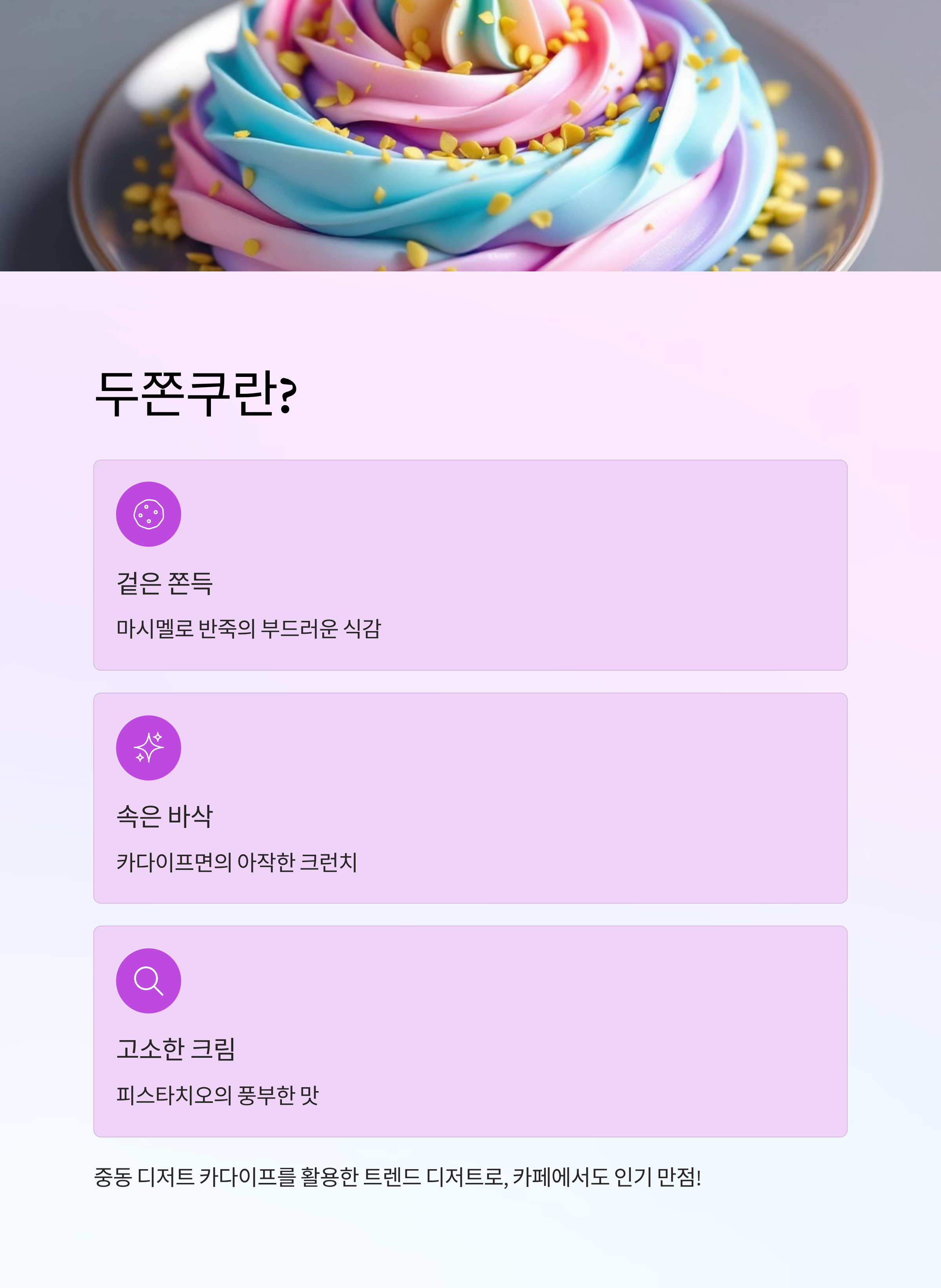 - 카다이프 대체: 볶은 라면·빵가루 가능(아작함은 감소)